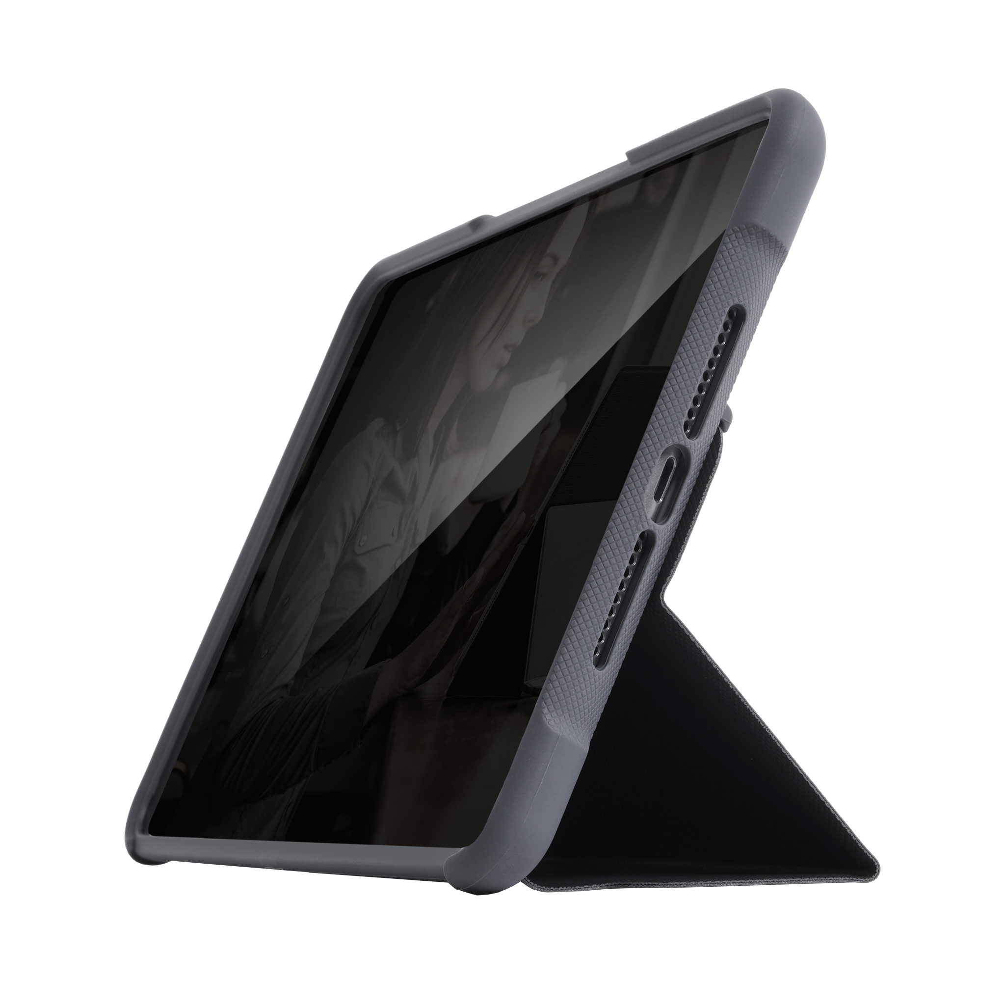 A rugged case that does not make your slim device big and bulky. Dux provides best-in-class protection for your iPad with a patented magnetic closure and tough, reinforced corners to protect from inadvertent drops. A clear polycarbonate back panel allows for easy ID or a creative touch of customisation. It also passed its military inspection with flying colors, exceeding U.S. Department of Defense Standard 810F/G drop testing protocols.