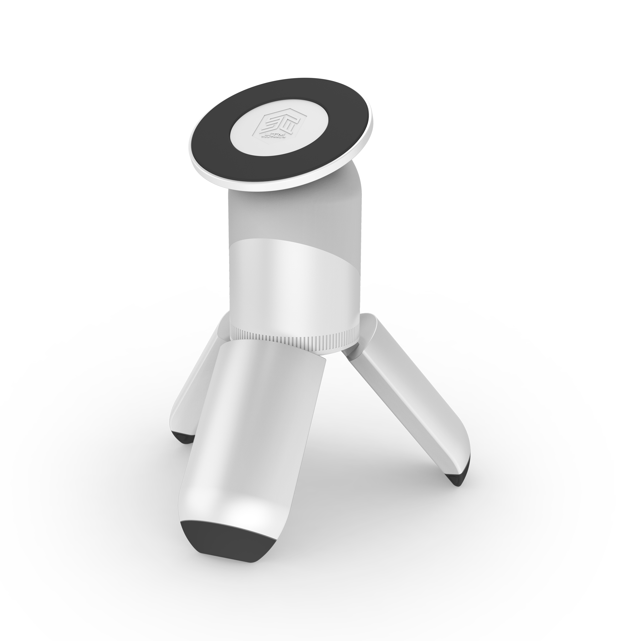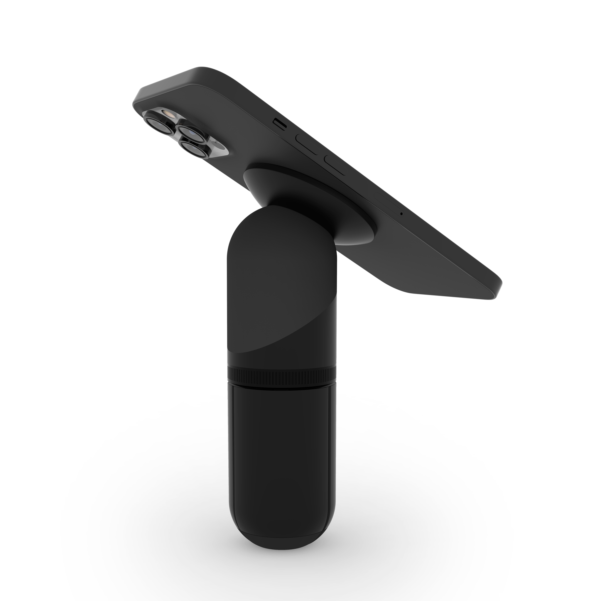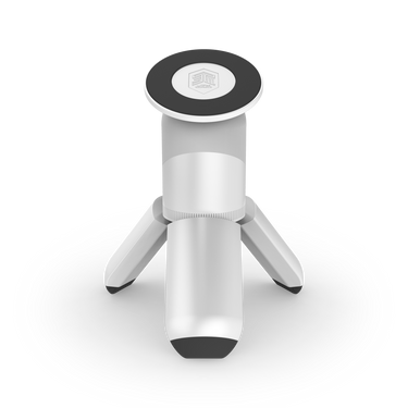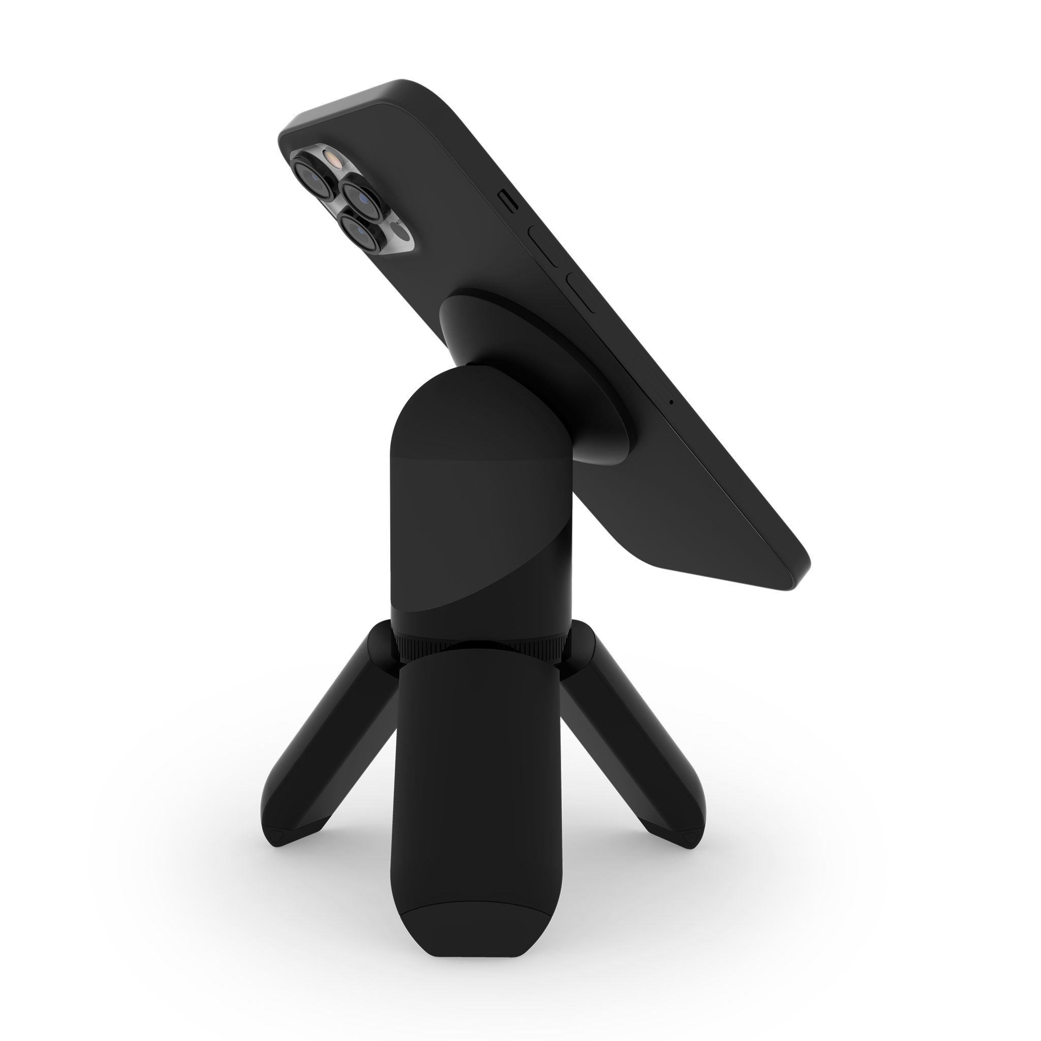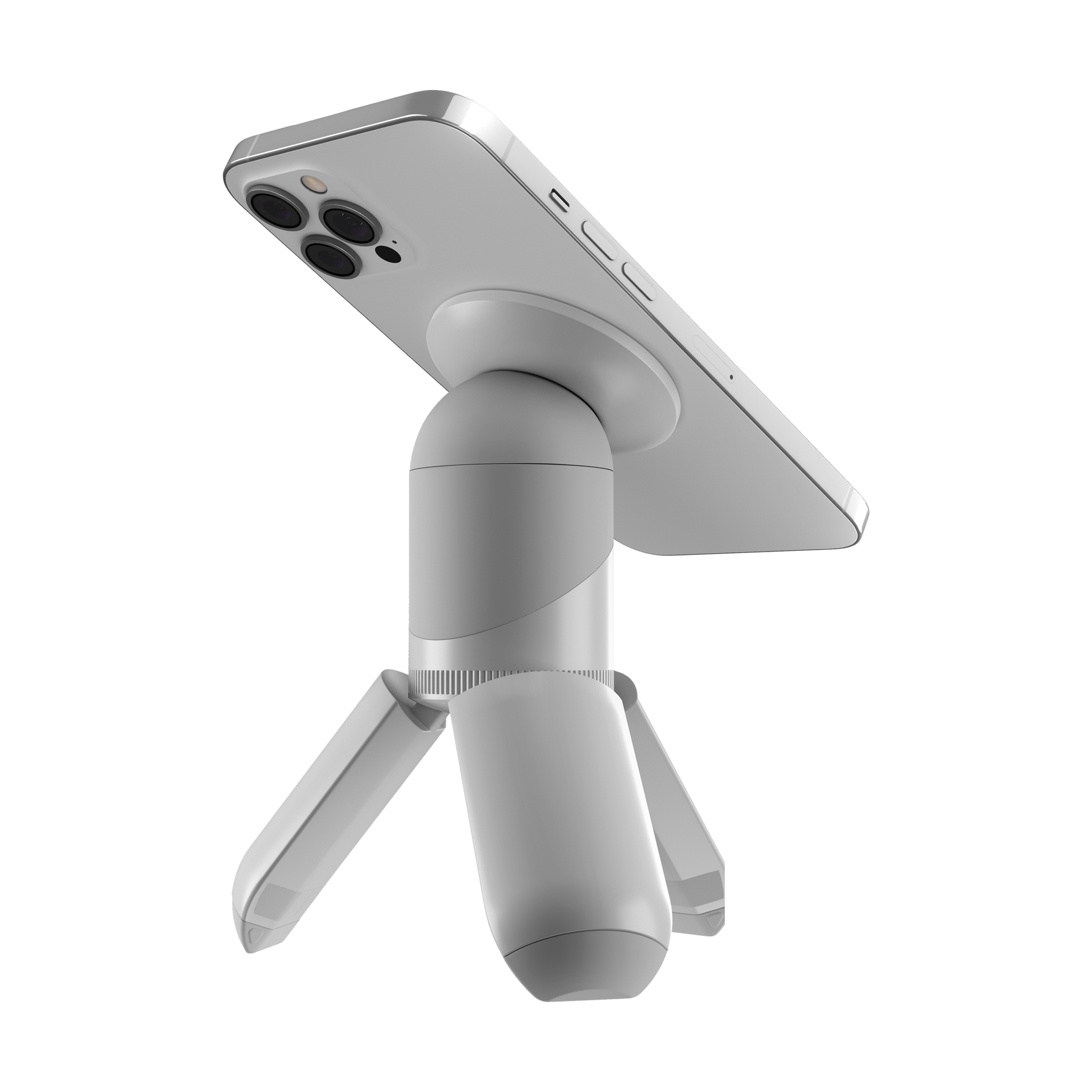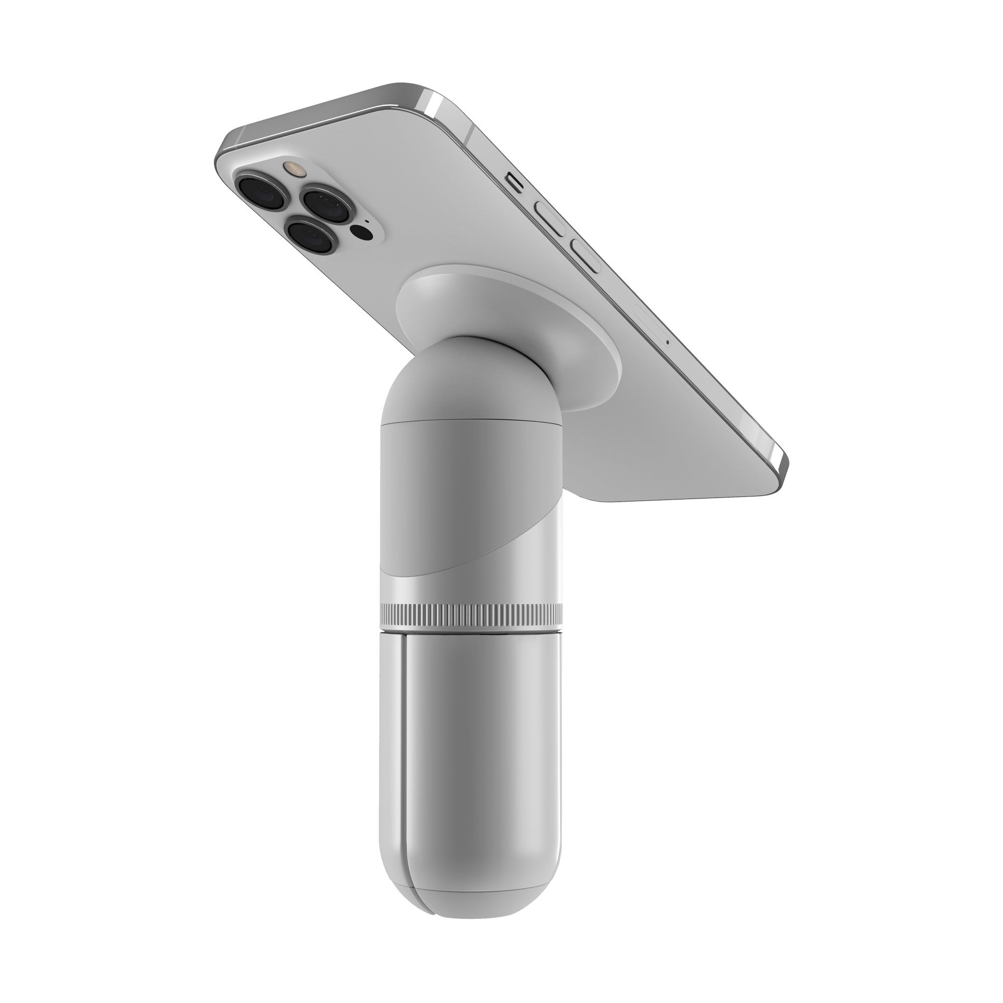 A brilliantly designed stand or handle for your MagSafe iPhone, providing the perfect parking spot anywhere you use your phone. The MagPod uses a magnetic disc atop a pivoting socket on a collapsible mini-tripod to give your MagSafe iPhone an elevated place in those crowded, cluttered, and sometimes unclean areas. The legs retract into a compact pod that makes a great handle for selfies and video, and then stores away into a pocket ever so easily.