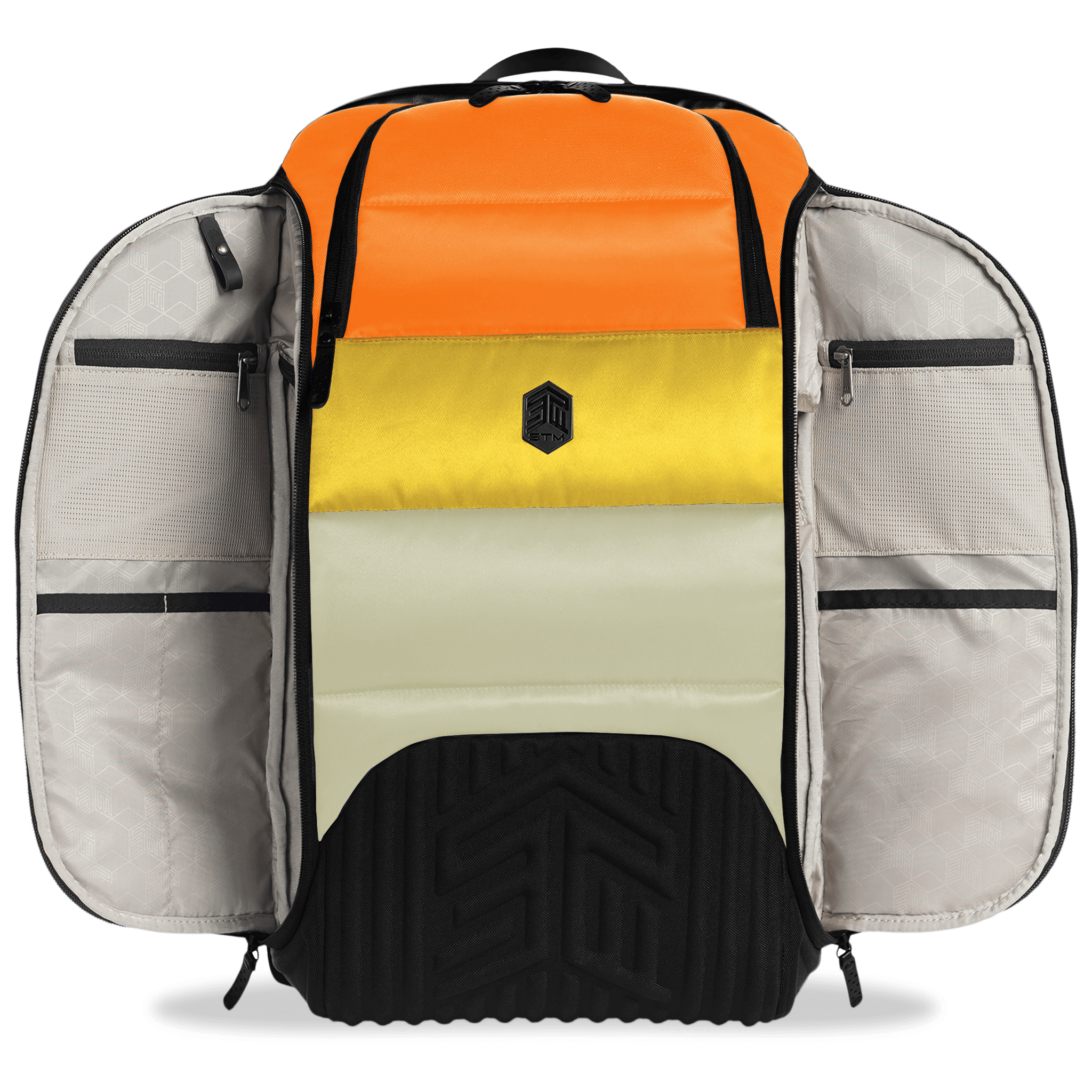 » Top-loading pocket for quick access with a convertible floor that zip-drops open to allow access to full depth of pack, plus cascading foldout pockets on front